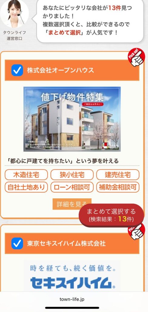 自分のエリアでどんな会社があるかは、入力してみるとわかります。私の場合は、13社ほど表示されて、大手ハウスメーカーだけでなく、これまで知らなかった工務店も入っていました。
