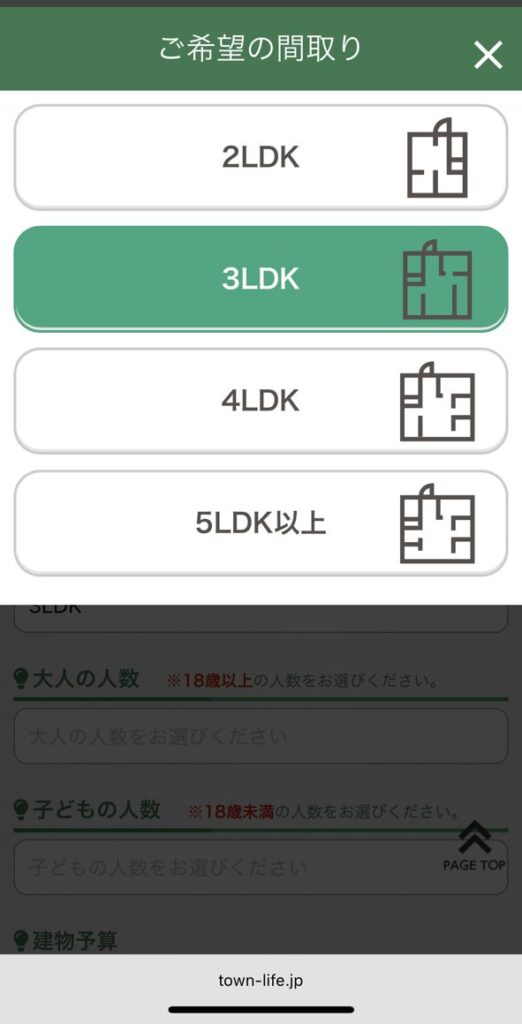 階数、希望の間取り、大人の人数、予算、土地の広さなど、どんどん選んでいきます。